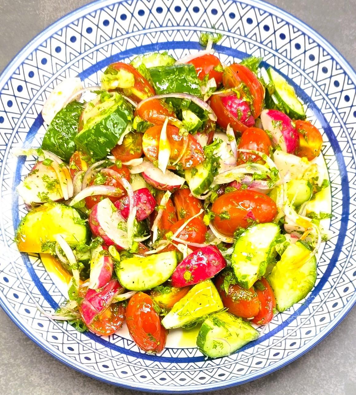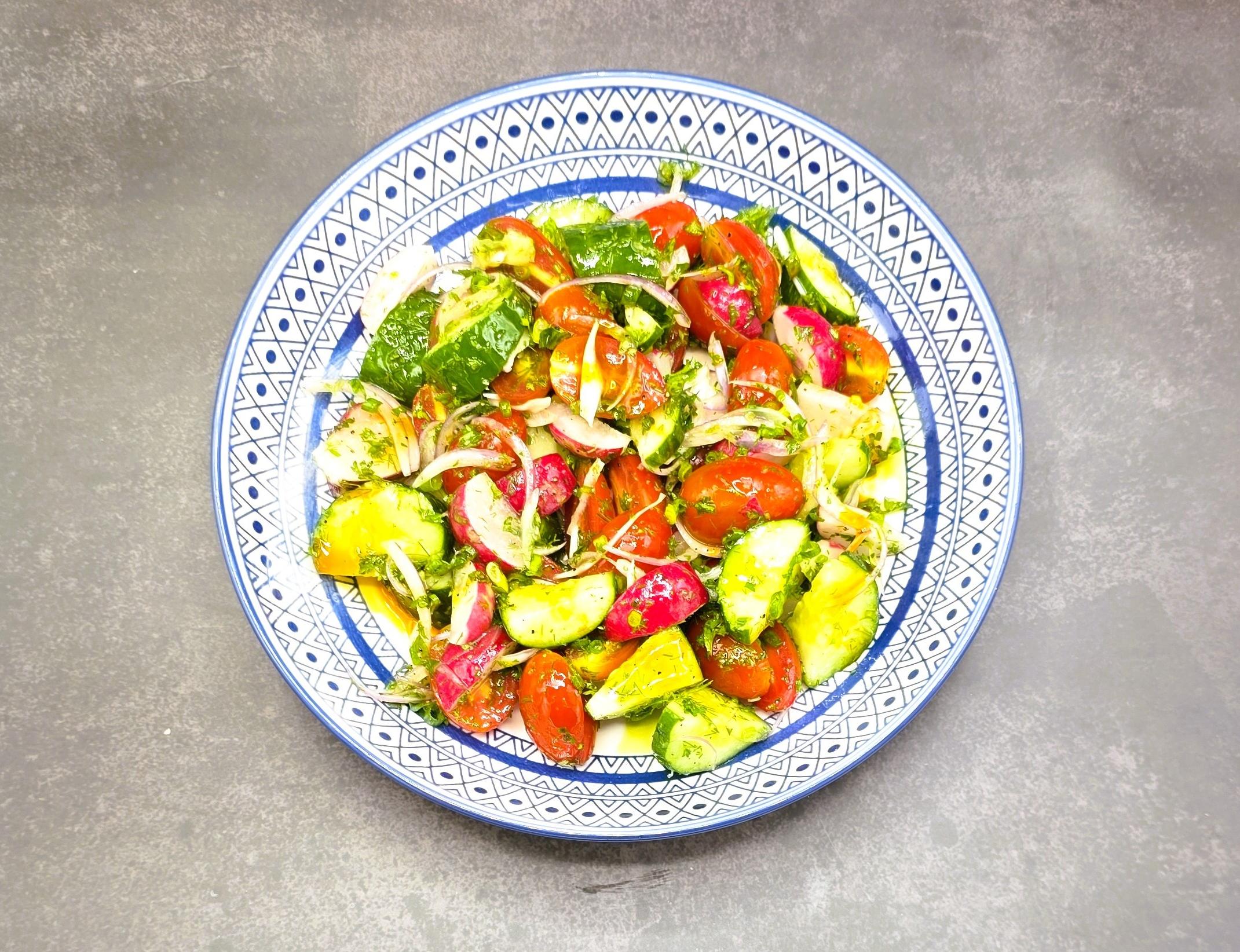 สลัดผักซอสเพสโตกรอบ สดใสทุกจานหลัก เสิร์ฟผักย่าง ฮัมมุสกับนาน และข้าวนึ่ง น้ำเปล่าและพาร์เฟต์เบอร์รี่ เบาสบาย